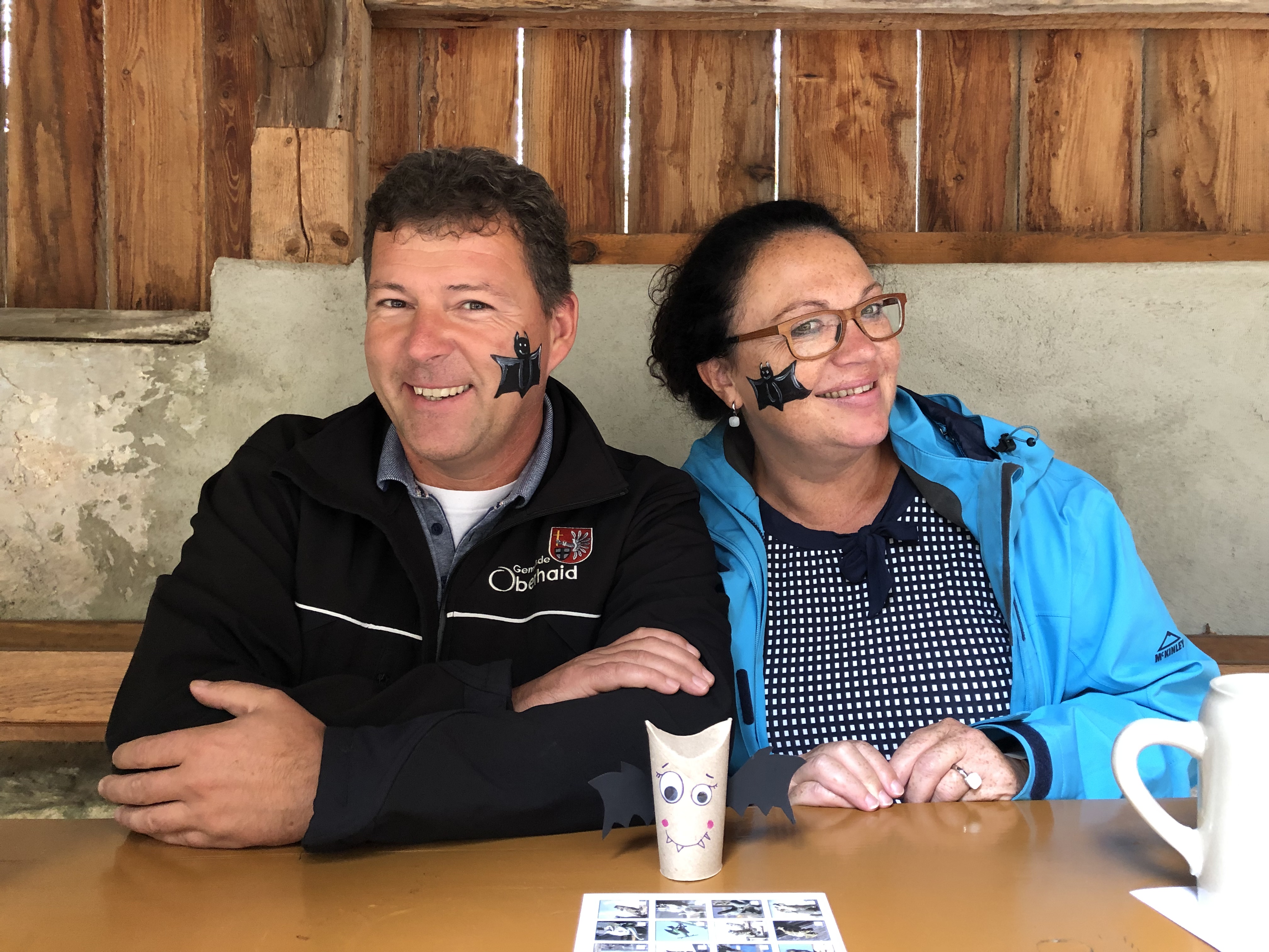 - Oberhaids Bürgermeister Carsten Joneitis und Bürgermeisterin Regina Wohlpart (Viereth-Trunstadt) ließen sich zum Ausklang des Tages von der DLRG ein „Fledermaustattoo“ schminken. Auf dem Tisch steht eine der von iso e. V. mit Kindern in Viereth aus einer Klorolle gebastelte Fledermaus. Foto: Gemeinde Oberhaid