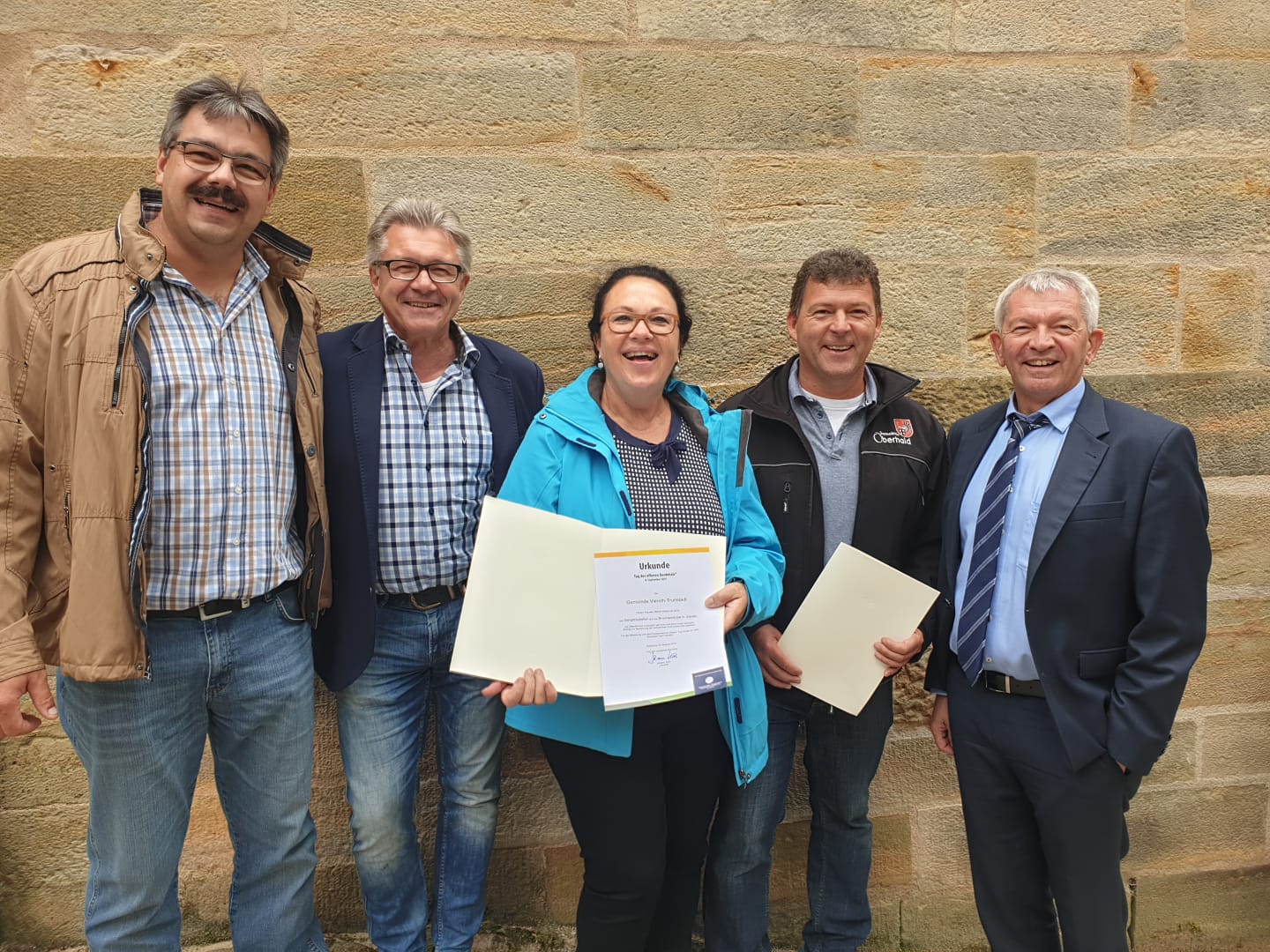In der Kellergasse Unterhaid begrüßte Landrat Johann Kalb die über 60köpfige Wandergruppe und überreichte Urkunden für die Teilnahme am Tag des offenen Denkmals an Bürgermeisterin Wohlpart und Bürgermeister Joneitis. „Es sei ein genialer Einfall gewesen, die beiden Kelleranlagen in dieser Form zu verbinden“ so Kalb. Er bedankte sich für das Engagement bei allen Beteiligten, vor allem auch bei seinen Mitarbeitern im Landratsamt, die sich unermüdlich für die Denkmäler im Landkreis einsetzen.